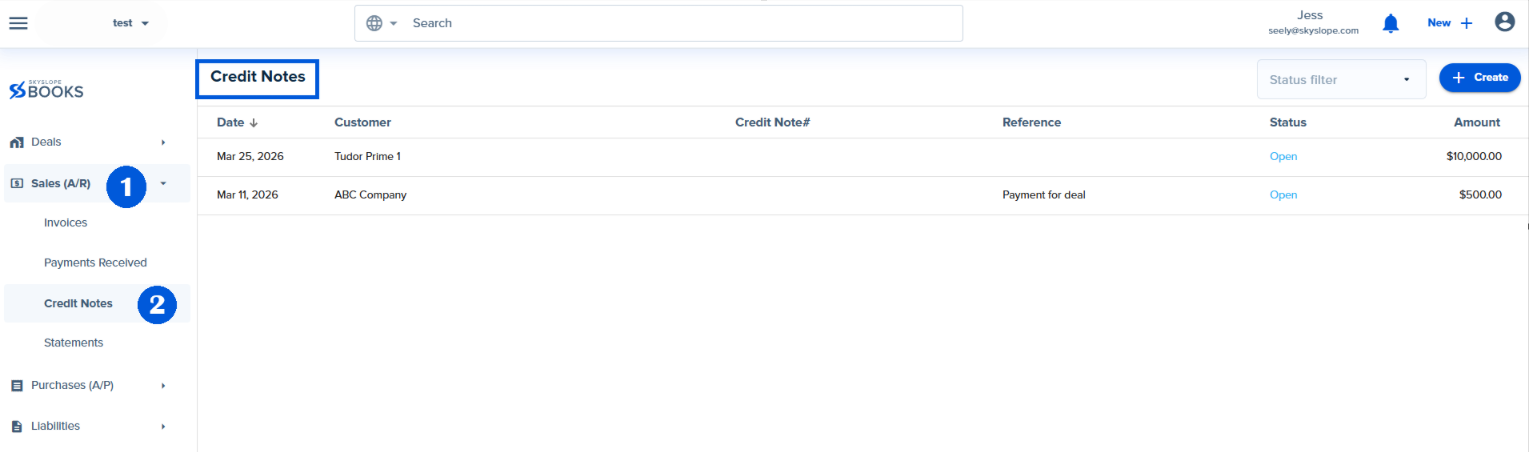 Credit notes in SkySlope Books are available in the Sales (A/R) section. Here you can add any credits you owe to contacts. If there are recurring credits you give to any contacts, those can added as well.