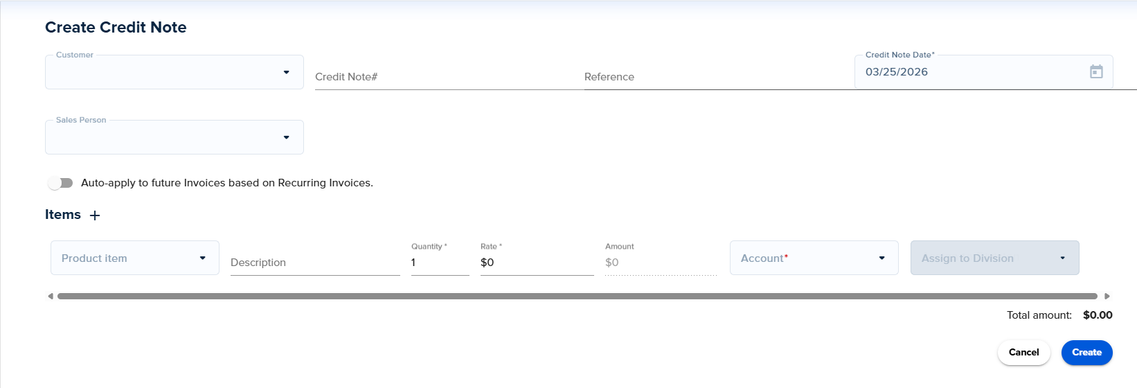 - Add the Description, Quantity, and Rate of the Product you are creating a credit note for.