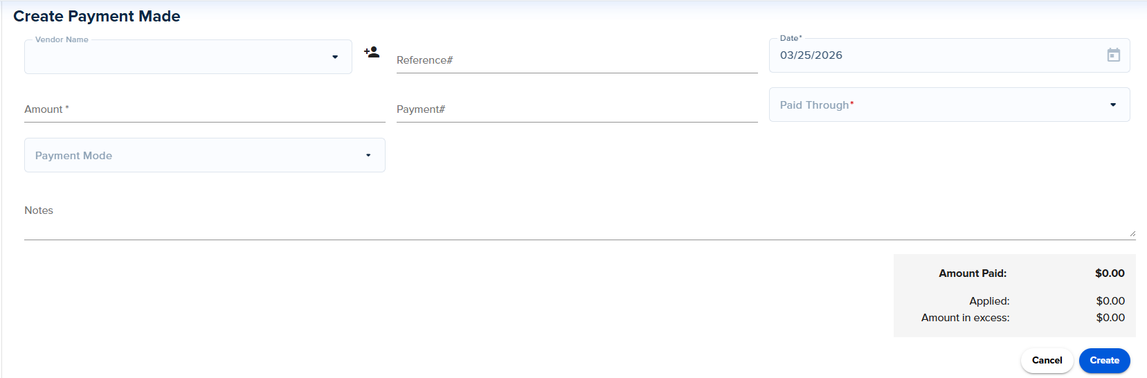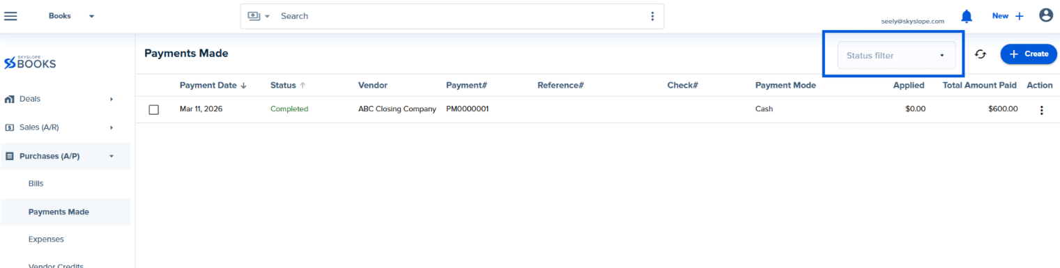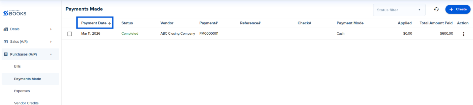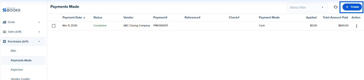 1. In the left menu, navigate to Purchases (A/P). Then go to the Payments Made section. This takes you to the Payments Made page.
