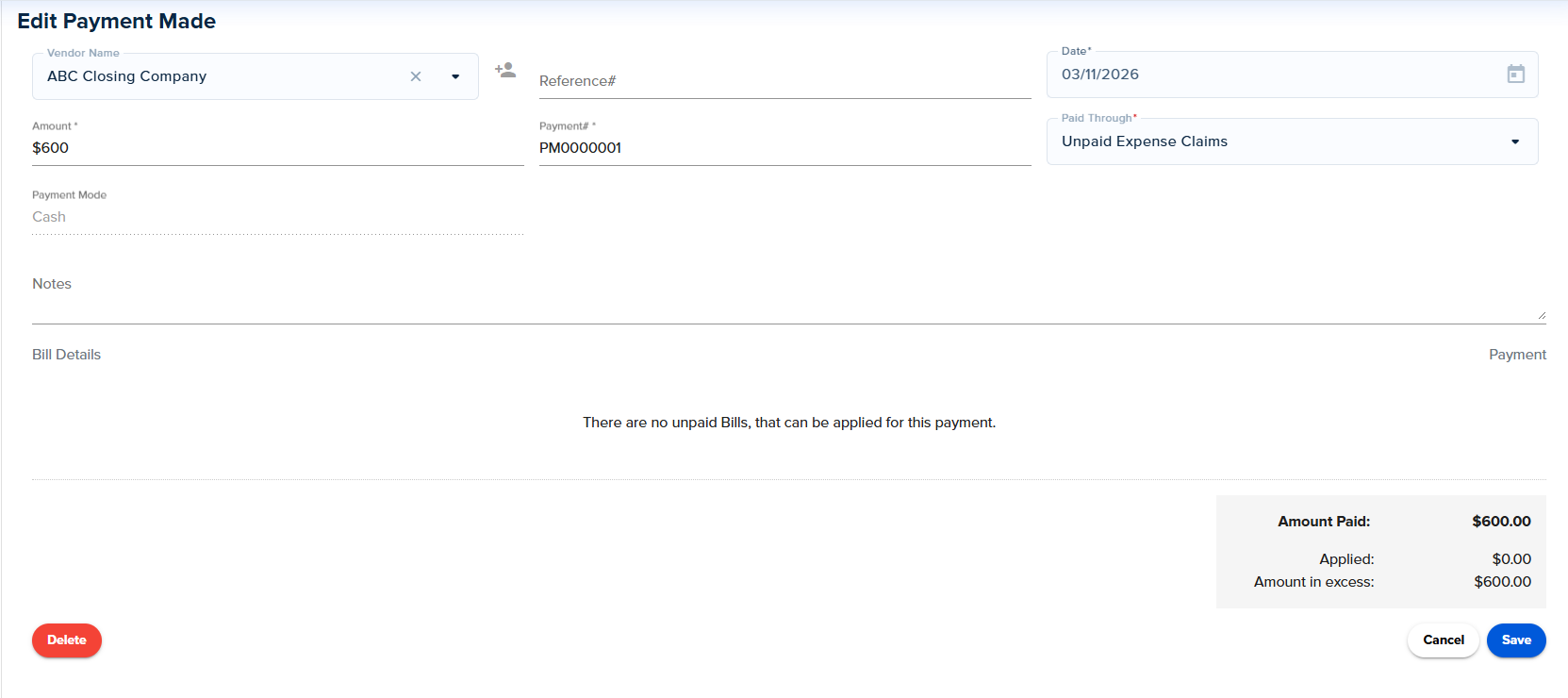 - Vendor Name: When you enter the vendor name, you will see all unpaid bill for that vendor