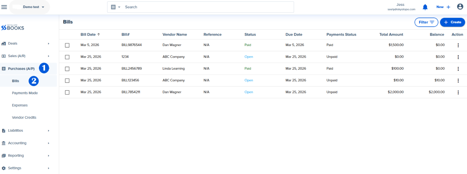 1. In the left menu, navigate to Purchases. Then go to the Bills section.