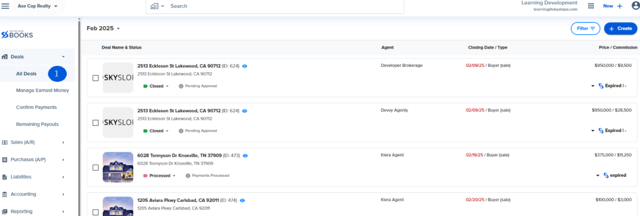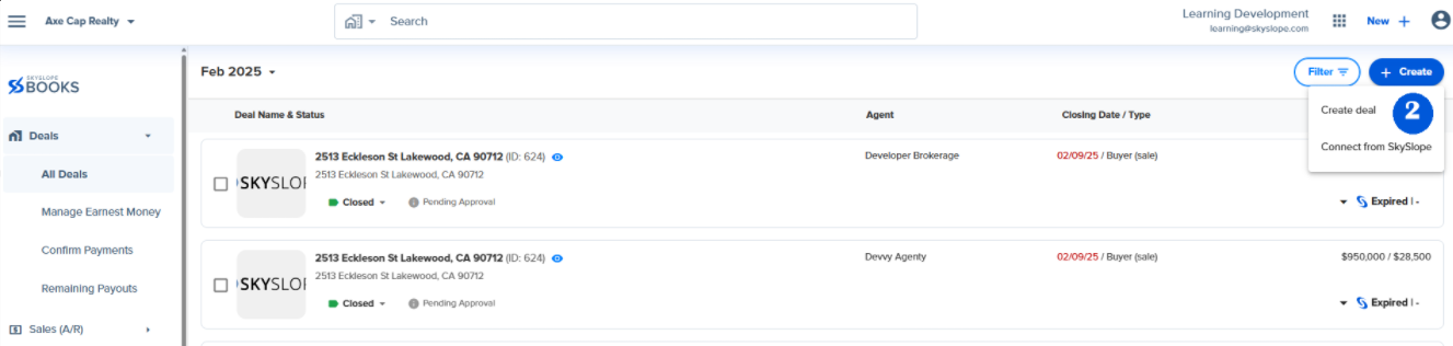 SkySlope Books provides you with the option to manually create deals. However, most brokerages opt to have deals automatically created in SkySlope Books via the integration.