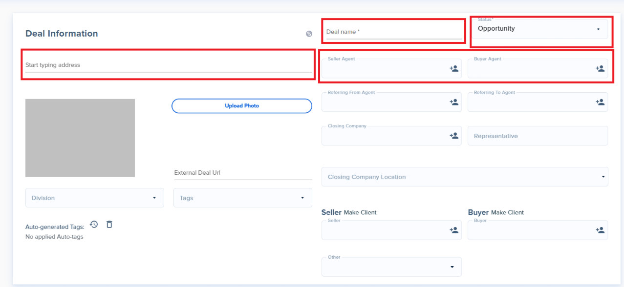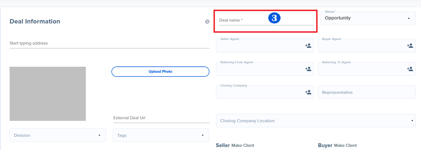 - Deal Name: After entering the property address, the Deal Name will automatically be the address