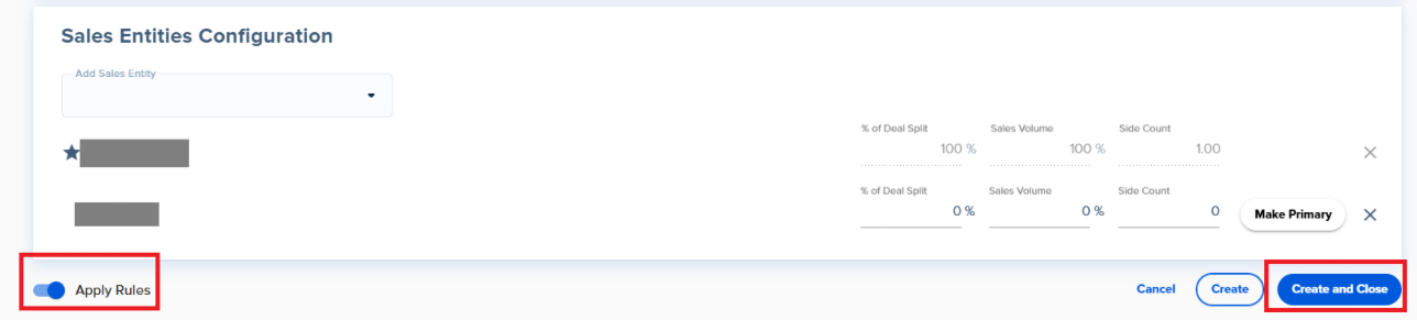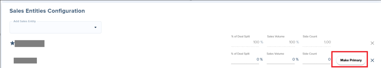 - Sales Entities Configuration card: This is where you ensure that you have the correct agent or agents listed as the sales entity. The current sales agent associated with the deal will be shown at the bottom of the card.