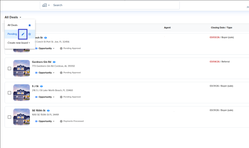7. To edit, locate the pencil icon by clicking the deal dropdown and hover over the name of the board you would like to edit. Next click on the pencil.